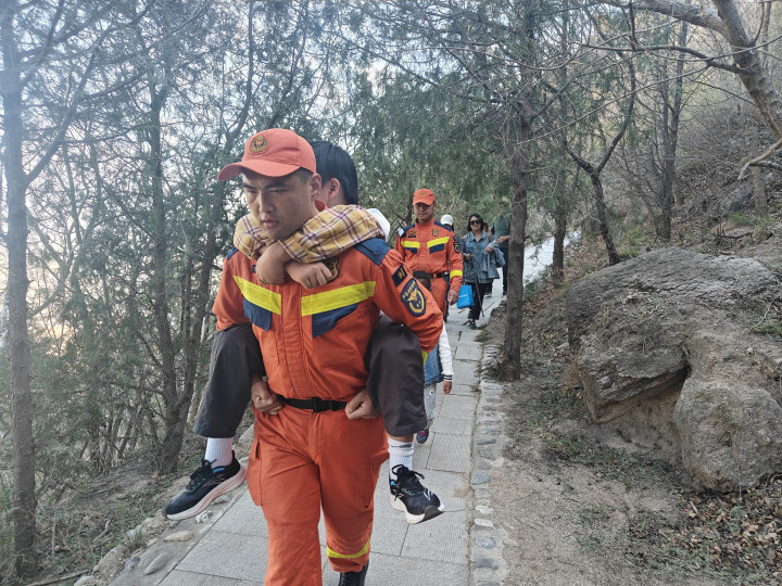 消防救援人员背男孩下山。图源:海淀区消防救援支队